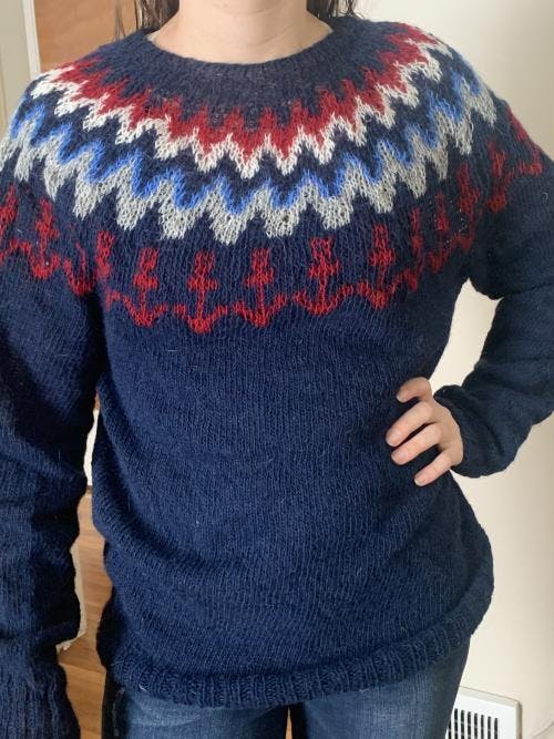 This knitting kit includes all material needed to make your own traditional Icelandic sweater: BLUE ANKER. Pullover made of Einband, designed by Guðrún Ragna Sigurjónsdóttir.