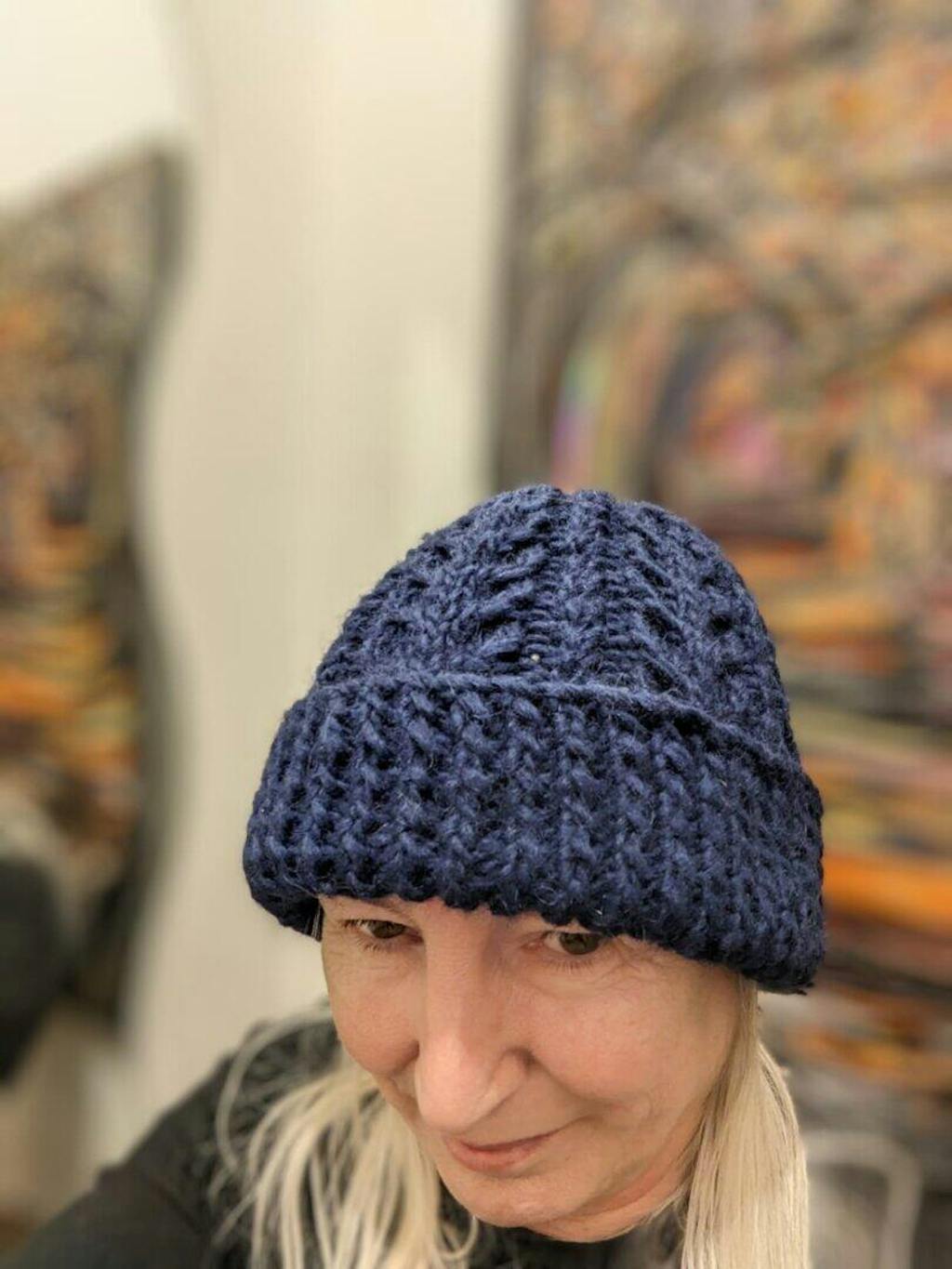 Here you can buy all included knitting kit for this sweater in blue and grey.