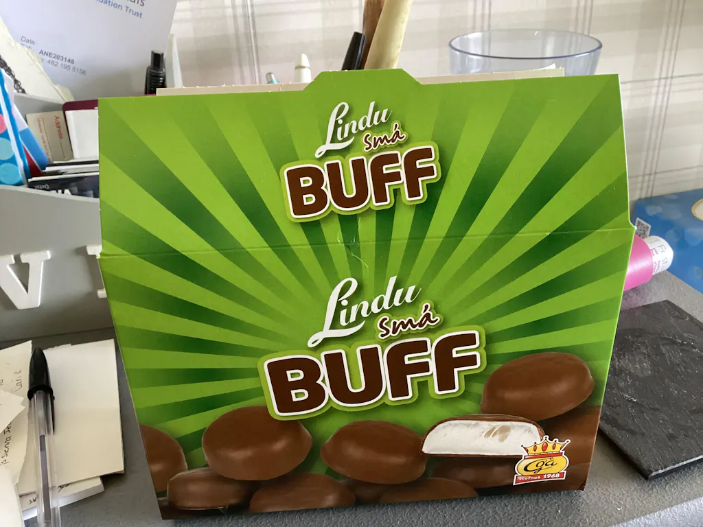 Ris Buff Crispy Chocolate bites or in Icelandic, Lindu smá Rís Buff, is a taffy cream/Marshmallow perfection dipped in chocolate and crispy corn puffs.